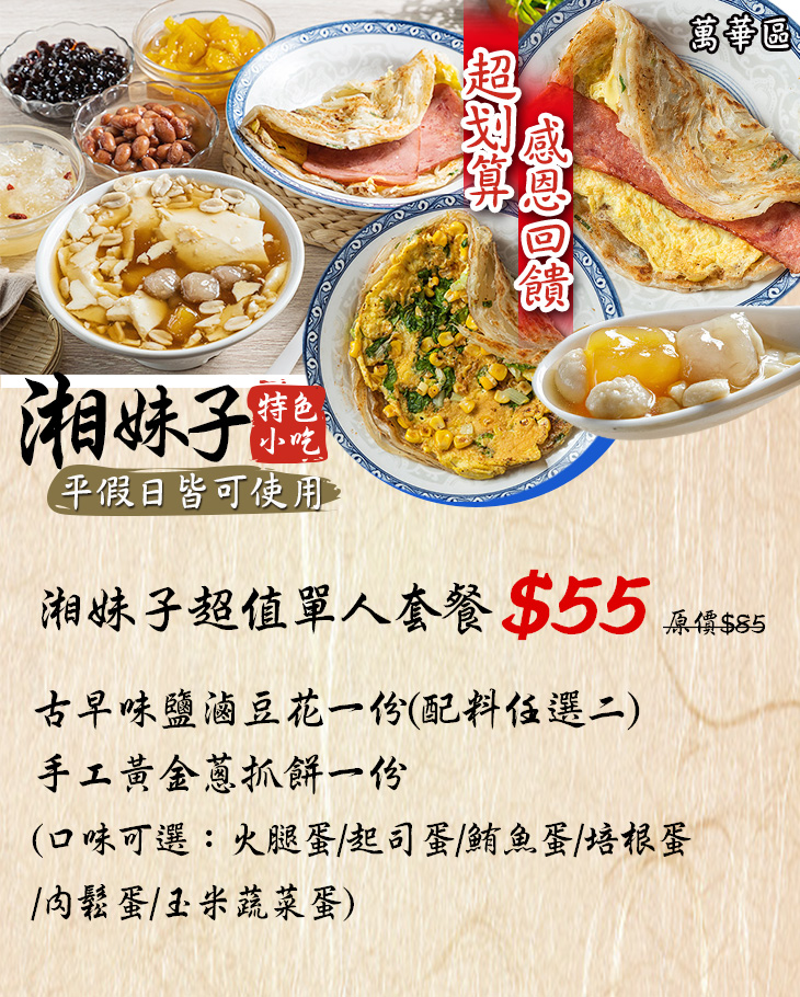 純手工、古早味的特色餐點,每一份都讓人想起懷舊且美好的老時光~豐富多元的菜單,從深受喜愛的風味蔥抓餅,到冰涼的豆花都有,精心手製的料理,每一樣都獨具懷舊、復古的特色,品嚐起來就是如此地扣人心弦~讓人吃完後還不斷回味!如果您還沒來過【湘妹子特色小吃】,那您絕對不能錯過這次機會,保證讓您一試成主顧!