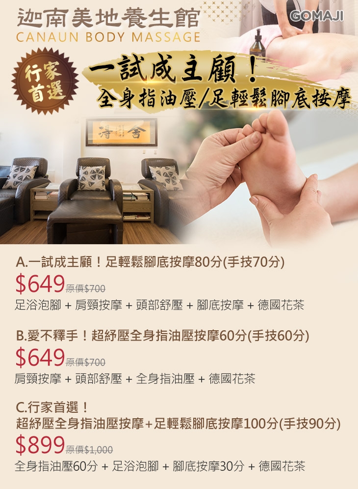 A.一試成主顧!足輕鬆腳底按摩80分(手技70分) / B.愛不釋手!超紓壓全身指油壓按摩60分(手技60分) / C.行家首選!超紓壓全身指油壓按摩+足輕鬆腳底按摩100分(手技90分)