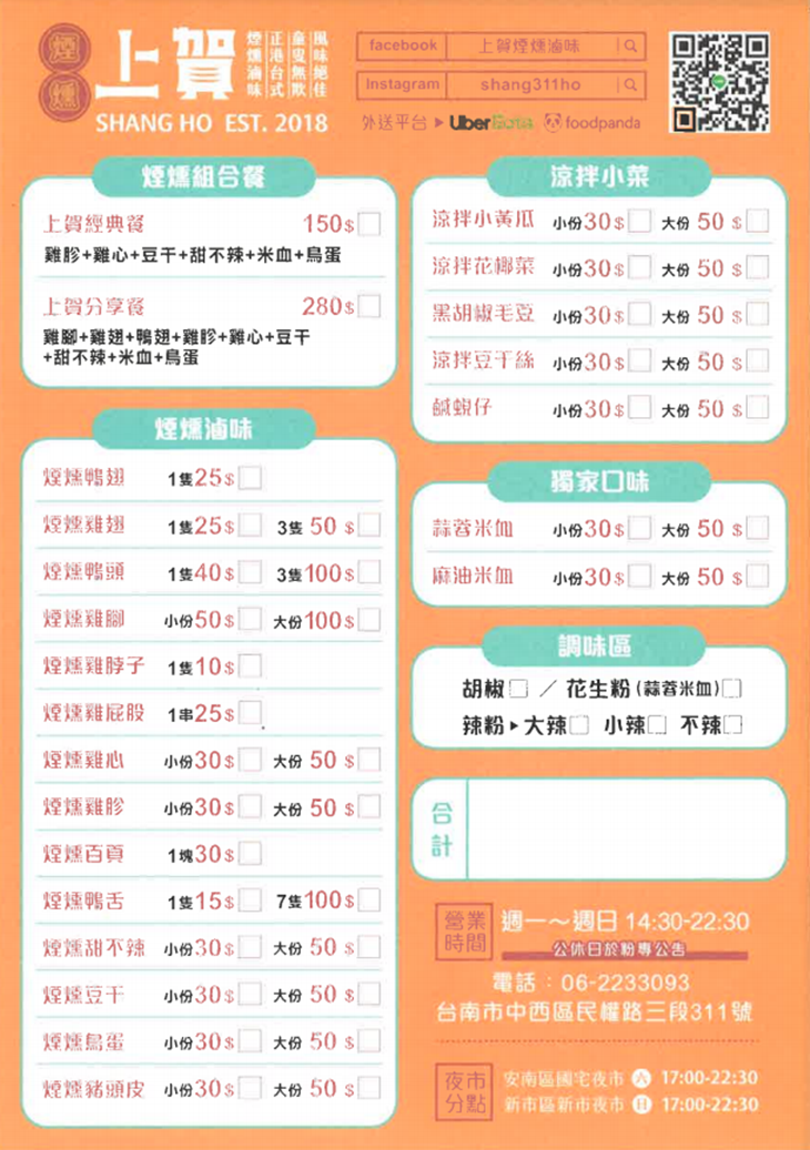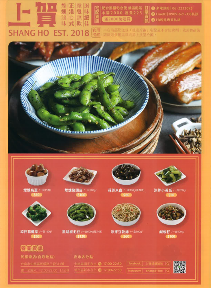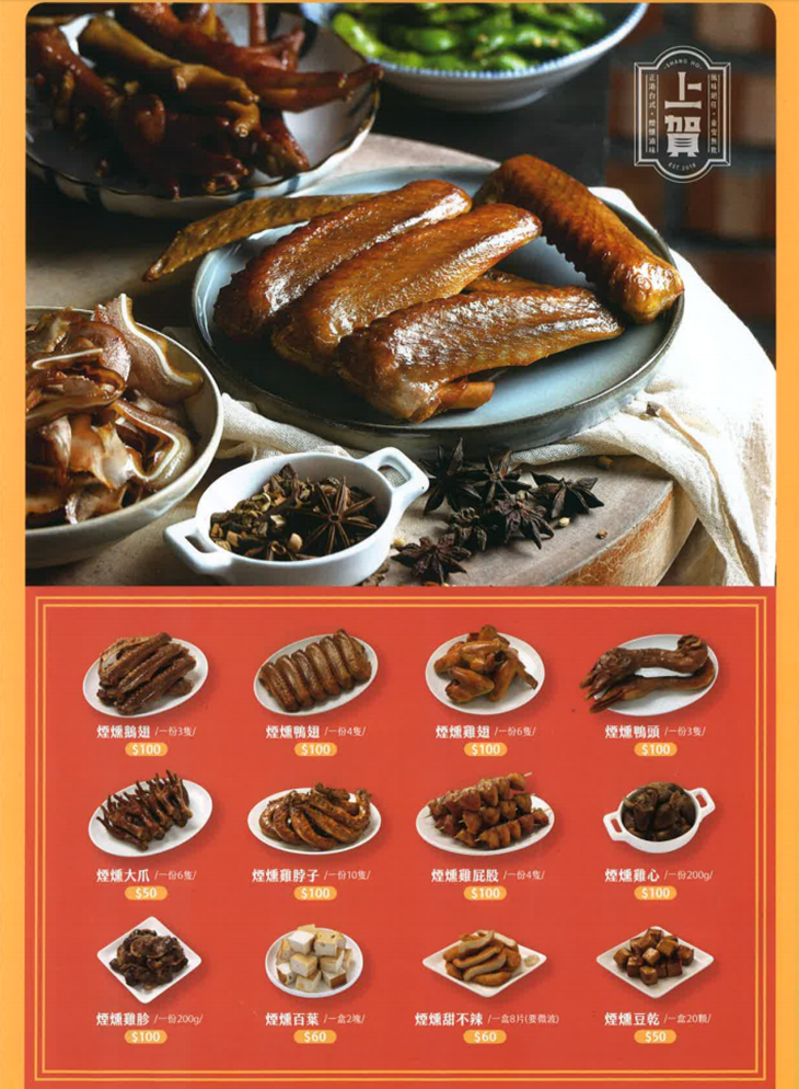 創立於2018年,雖然是由年輕八年級生創立的,傳承的卻是上一代的好手藝。2018年開始從台南的觀光區到台南各個中小型夜市都不乏看過「上賀」的身影,直到2020年「上賀」終於開設了第一間外帶店面,就位在熱鬧的中西區民權路三段上,專賣煙燻滷味與涼拌小菜。「上賀」有別於傳統滷味,不用老滷汁,每日現作滷湯,加上每日嚴選新鮮食材、製程中也不添加防腐劑、色素、人工香料,兼顧健康與美味,希望讓每位客人都能吃到安心好吃的滷味食品!