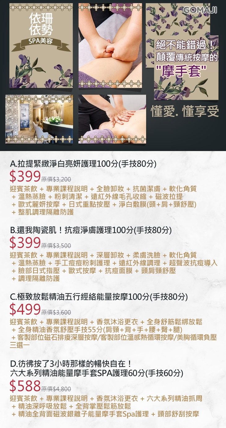 A.拉提緊緻淨白亮妍護理100分(手技80分) / B.還我陶瓷肌!抗痘淨膚護理100分(手技80分) / C.極致放鬆精油五行經絡能量按摩100分(手技80分) / D.彷彿按了3小時那樣的暢快自在!六大系列精油能量摩手套SPA護理60分(手技60分)
