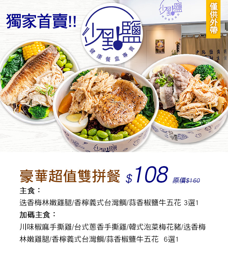 想要「減脂」或「增肌」靠飲食很重要,但誰說瘦身只能靠清淡的水煮餐?想要吃得美味、健康輕負擔,現在難度一點都不高,「少點鹽健康餐盒專賣」,主打低卡、低脂、低油鹽,食材講究,並採用法式低溫真空「舒肥法 sous vide」烹調,不僅用香料和天然食材取代味精、鹽巴,鮮豔配菜更是少不了,整碗超澎湃,現在只要用甜甜的價格,就能品嚐到健康豪華餐,心動的朋友可別錯過囉!
