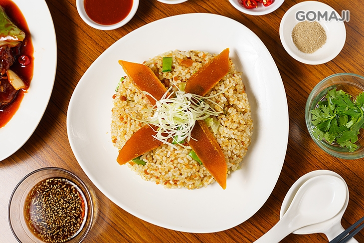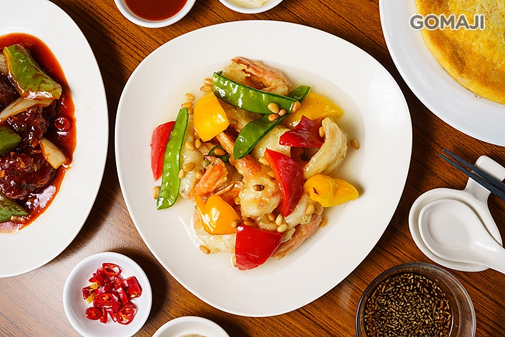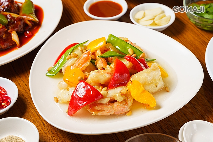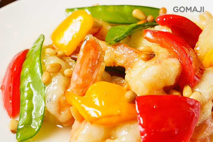 彈牙甘甜的鮮蝦球,佐以繽紛的蔬菜烹炒,稍微勾芡的口感,讓整體濕潤卻不軟爛,松子獨特的香氣點綴在其中,讓整份菜餚嚐起來別有一番風味~扣人心弦的美味,保證讓您沒齒難忘!