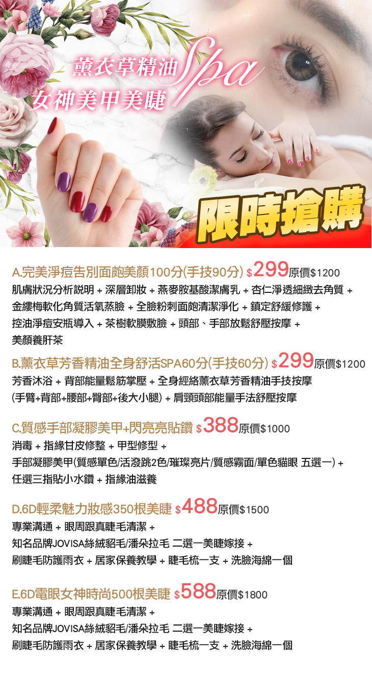 A.完美淨痘告別面皰美顏100分(手技90分) / B.薰衣草芳香精油全身舒活SPA60分(手技60分) / C.質感手部凝膠美甲+閃亮亮貼鑽 / D.6D輕柔魅力妝感350根美睫 / E.6D電眼女神時尚500根美睫