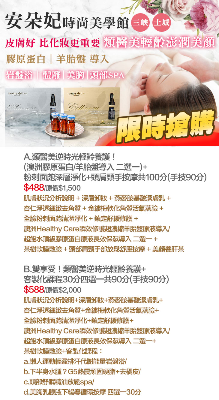 A.類醫美逆時光輕齡養護!(澳洲膠原蛋白/羊胎盤導入 二選一)+粉刺面皰深層淨化+頭肩頸手按摩共100分(手技90分) / B.雙享受!類醫美逆時光輕齡養護+客製化課程30分四選一共90分(手技90分)
