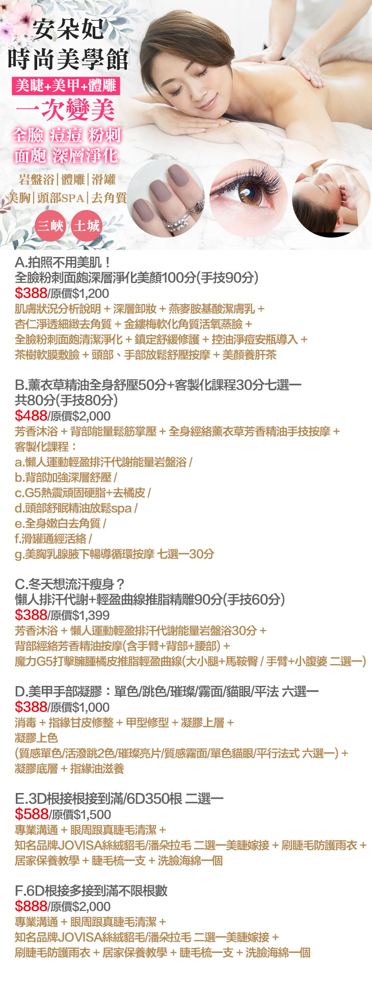 A.拍照不用美肌!全臉粉刺面皰深層淨化美顏100分(手技90分) / B.薰衣草精油全身舒壓50分+客製化課程30分七選一共80分(手技80分) / C.冬天想流汗瘦身?懶人排汗代謝+輕盈曲線推脂精雕90分(手技60分) / D.美甲手部凝膠:單色/跳色/璀璨/霧面/貓眼/平法 六選一 / E.3D根接根接到滿/6D350根 二選一 / F.6D根接多接到滿不限根數
