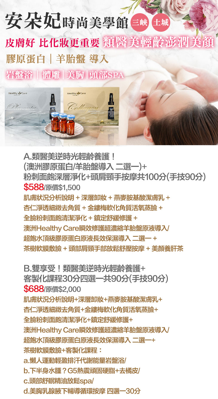 A.類醫美逆時光輕齡養護!(澳洲膠原蛋白/羊胎盤導入 二選一)+粉刺面皰深層淨化+頭肩頸手按摩共100分(手技90分) / B.雙享受!類醫美逆時光輕齡養護+客製化課程30分四選一共90分(手技90分)