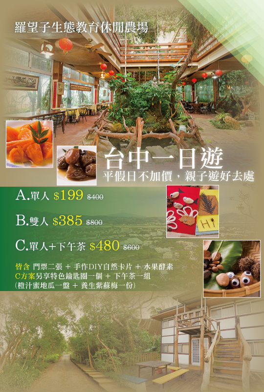 B.雙人〈含入園門票二張 + 手作DIY二組自然卡片 + 水果酵素二杯〉