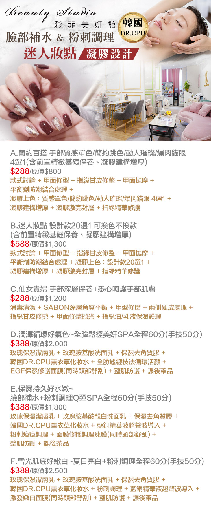 A.簡約百搭 手部質感單色/簡約跳色/動人璀璨/爆閃貓眼 4選1(含前置精緻基礎保養、凝膠建構增厚) / B.迷人妝點 設計款20選1 可換色不換款(含前置精緻基礎保養、凝膠建構增厚) / C.仙女貴婦 手部深層保養+悉心呵護手部肌膚 / D.潤澤循環好氣色~全臉鬆經美妍SPA全程60分(手技50分) / E.保濕持久好水嫩~臉部補水+粉刺調理Q彈SPA全程60分(手技50分) / F.雪光肌底好嫩白~夏日亮白+粉刺調理全程60分(手技50分)