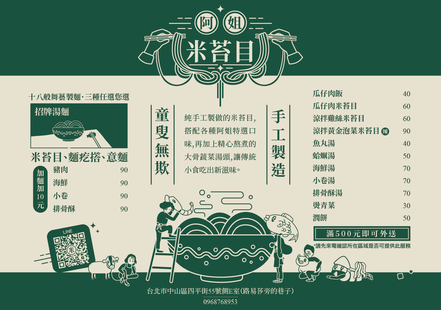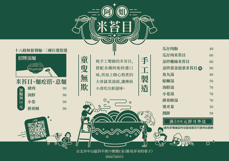 近松江南京站7號出口!不同一般的台式小吃店,「阿姐米苔目」跳脫出過去的框架,以優雅的孔雀綠色當作主視覺色,配上精心設計過的LOGO,時尚新穎又不失復古感,非常吸睛!店如其名,店內主打料多味美的米苔目,有海鮮、小卷、豬肉、瓜仔肉等多種口味,滿足每一位顧客挑剔的味蕾,希望來店的朋友都能感受到闆娘滿滿的心意!