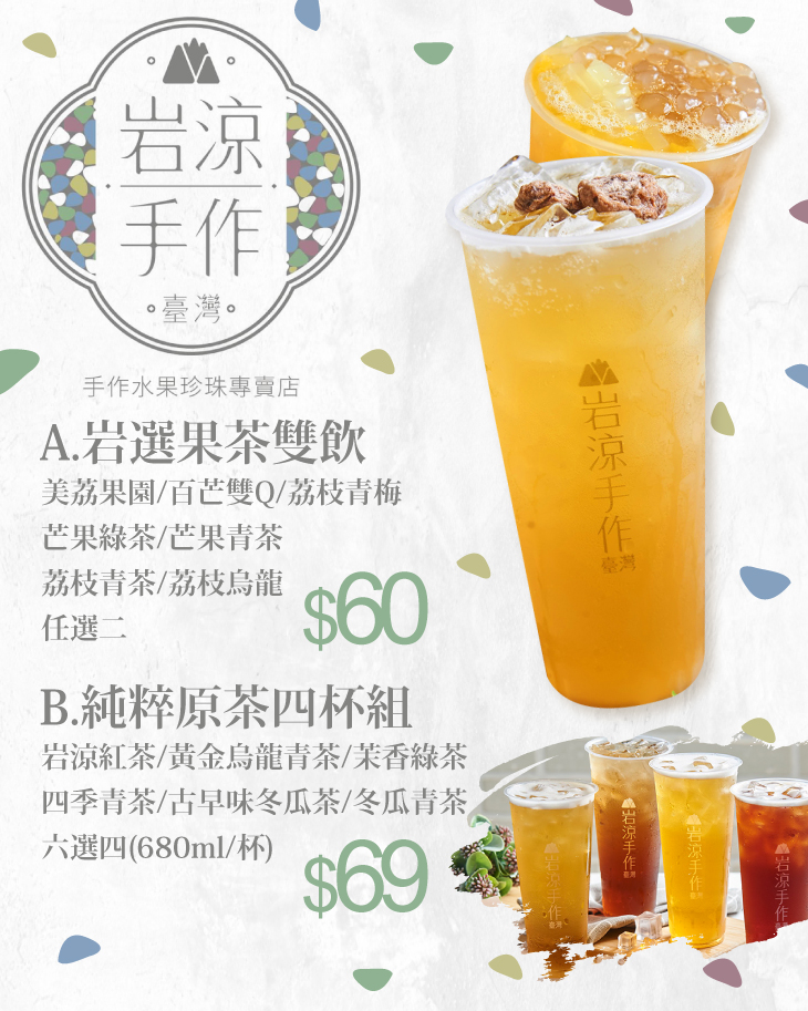 位於高雄市三民區陽明路上,岩涼手作以台灣懷舊古早味 x 文青風為整體品牌形象,並以手作珍珠系列、新鮮水果茶系列、懷舊文青系列作為品牌主軸,每一杯飲品以及珍珠都是在顧客面前製作,完美體現「手作」的職人精神,帶領您細細品味茶飲的新鮮與甘醇,體驗手作茶的獨有魅力!