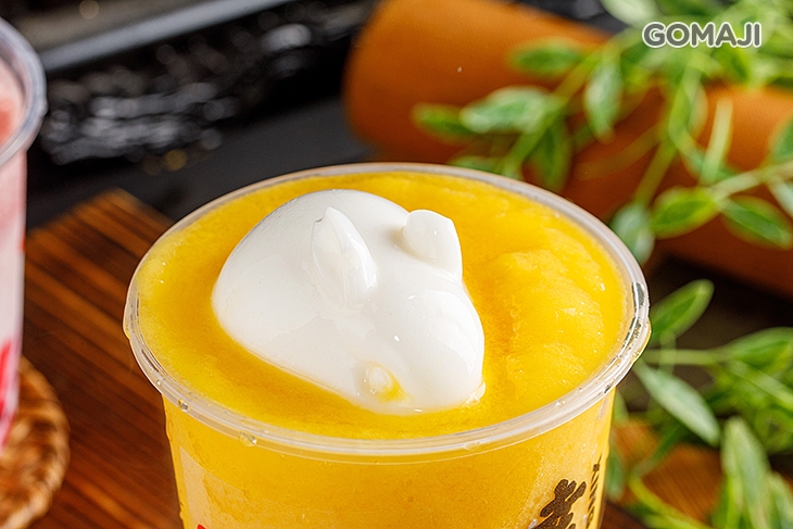 說到蹦蹦跳,是不是會聯想到可愛的兔子呢?這杯取名俏皮的「芒果蹦蹦跳」,不只品名讓人印象深刻,還真的有一隻雪白的萌兔兔在飲品上方唷!以黃金比例調配的愛文芒果冰沙,口感濃郁香甜,再加入一顆顆色澤夢幻的草莓珍珠以及水果優格果凍,果凍嚐起來香滑Q軟,圓滾滾的萌兔造型,讓人捨不得一口吃掉呢 ~ 這個夏天必點的飲品絕對非它莫屬!