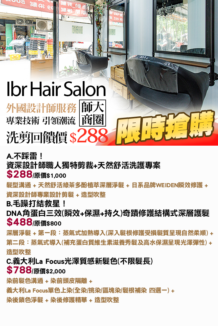 寬敞舒適的美髮沙龍環境,讓人一進到店裡便卸下煩心事物,感到無比放鬆。來自約旦首都安曼的資深設計師Ibr,將東西方南轅北轍的技藝與觀念,融入自身的設計理念中,創造出獨一無二的髮藝,憑著三十年的美髮經驗,就是要替您設計出夢想中的完美造型!不論是髮品的選擇,或是髮藝技術的呈現,這裡都絕不馬虎,給您的秀髮最完善的照顧,每次的變髮都能散發出有別於以往的專屬氣質!