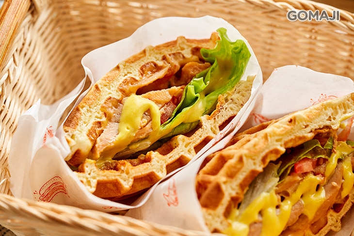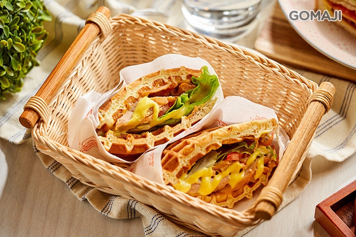 現烤鹹鬆餅,因為麵糊有著完美比例調配,故品嚐起來相當鬆軟酥綿!搭配重點人物 - 迷迭香雞腿排,還有生菜、風味醬汁,讓鹹鬆餅整體美味還有口感層次大大躍升!鬆餅外酥內軟、雞腿排肉嫩味佳,創意組合,無論男女老少都為之瘋狂。
