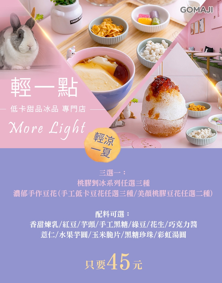 於2019年12月成立的【輕一點 More Light 低卡甜品冰品 專門店】,在IG、FACEBOOK各大社群平台小有名氣!粉底白字搭配超Q兔子圖案的造型招牌,在人車來往的中埔七街上,成功吸引路人目光。