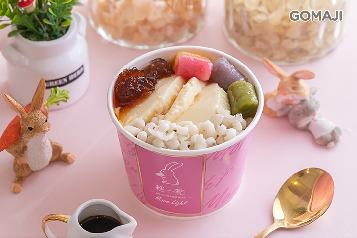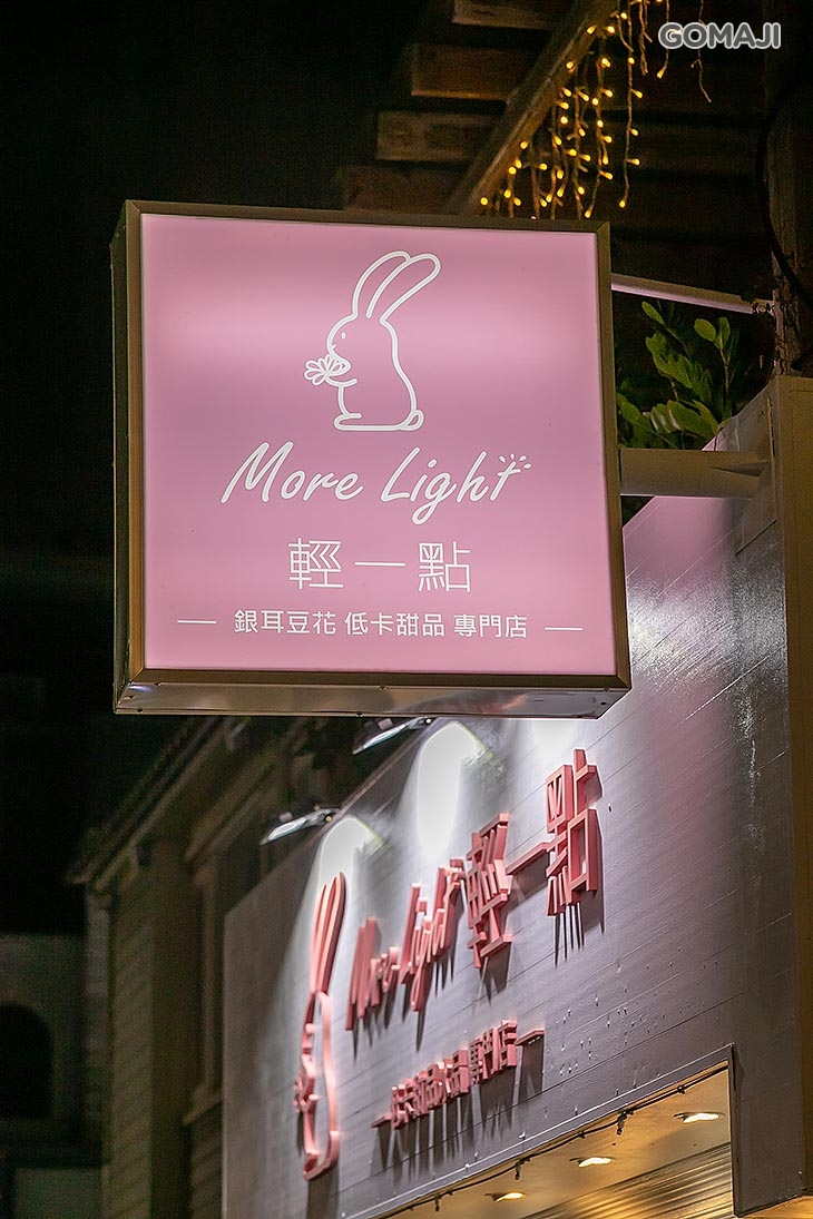 〝輕一點 More Light 〞,light 有『輕盈』和『光』的雙重意思,店取名呼應自家的經營理念。希望帶給顧客光明且正向的感覺。此外,餐點主打低熱量優質蛋白手工豆花、天然植物膠原銀耳羹、低糖飲品等以健康、無負擔的甜品為主。並提供多種珍貴食材如桃膠、雪燕、皂角米等高纖低卡的天然食材作搭配,讓餐點因為有了它們的點綴,而更加美味。