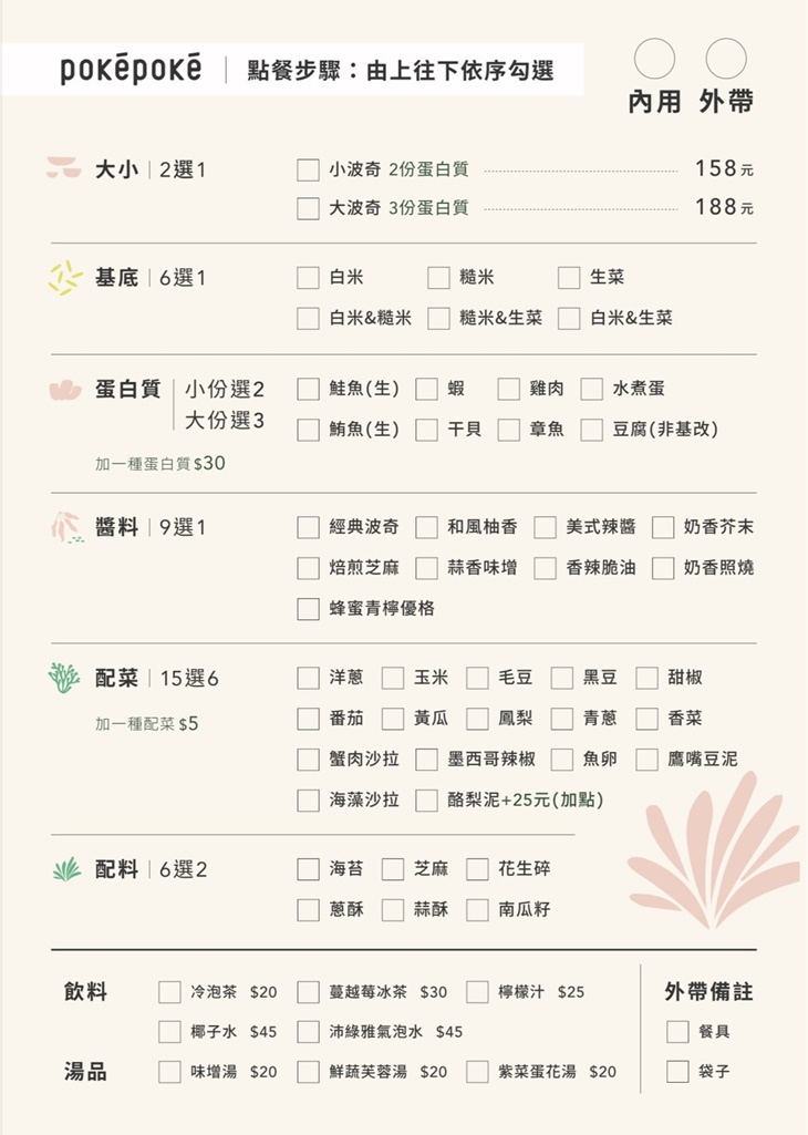 【PokéPoké 波奇波奇(中港店)】專營來自夏威夷的美食PokéPoké,粉紅色的外觀搭配柔和的葉綠色,加上一些很有異國特色的燈飾擺件,不禁令人聯想到夏威夷的景緻。「波奇」意指夏威夷原住民將生魚肉切丁的料理,後接觸各國飲食文化的融合,成為獨特的"美式生魚丼",「天然的食材、健康的理念、自由配的趣味」,符合現代的"健康飲食風",快來波奇波奇做一碗專屬於您的美味吧!