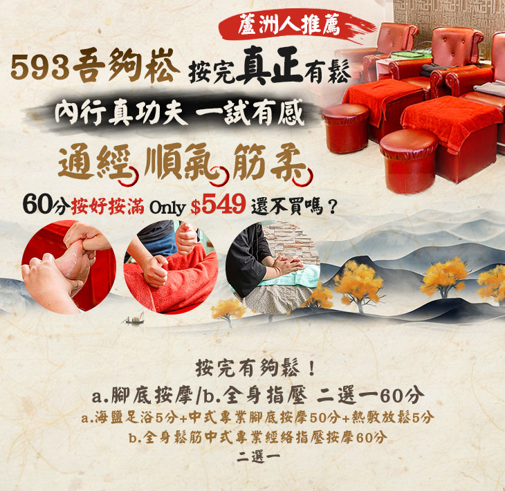 店內擁有多位專業按摩師傅,每一位都累積了多年經驗,服務過無數客人,無論是腳底或全身性的按摩,技術和力度都掌握得相當純熟!平時久站、久坐等造成身體的各種不適,都能在師傅的手下獲得舒緩,親民的價格,就能體驗您目前最需要的課程,下班後或放假時,別忘了來到「593吾夠崧按摩」好好放鬆一下唷!