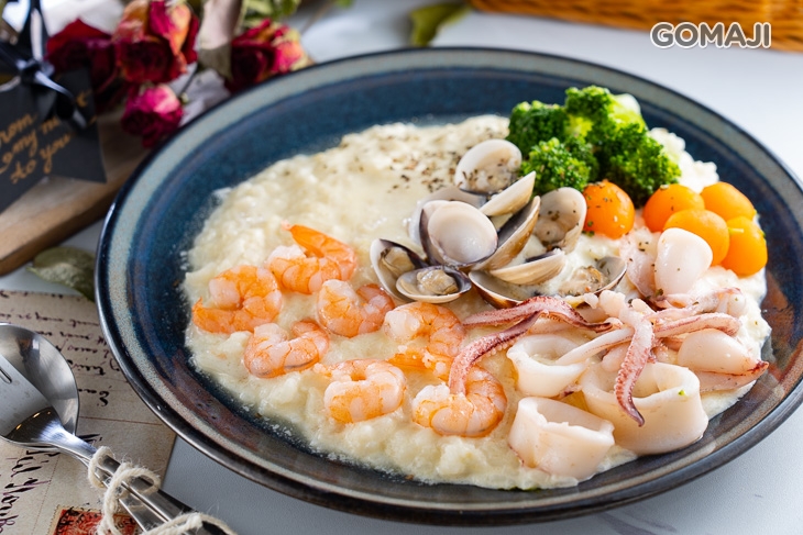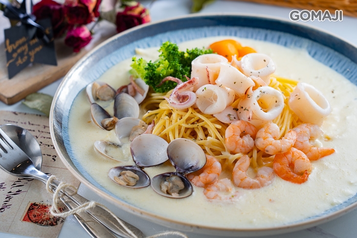 使用滿滿新鮮海鮮入料的白醬海鮮義大利麵,彈牙勁道的義大利麵,與豐盛、豪華的海鮮相佐,並以奶香醇厚、濃郁可口的白醬入味,細細品嚐,蛤蠣獨特的甘甜與鮮蝦極鮮的滋味令人叫好,彈牙的花枝則點綴繽紛口感,讓人回味無窮!