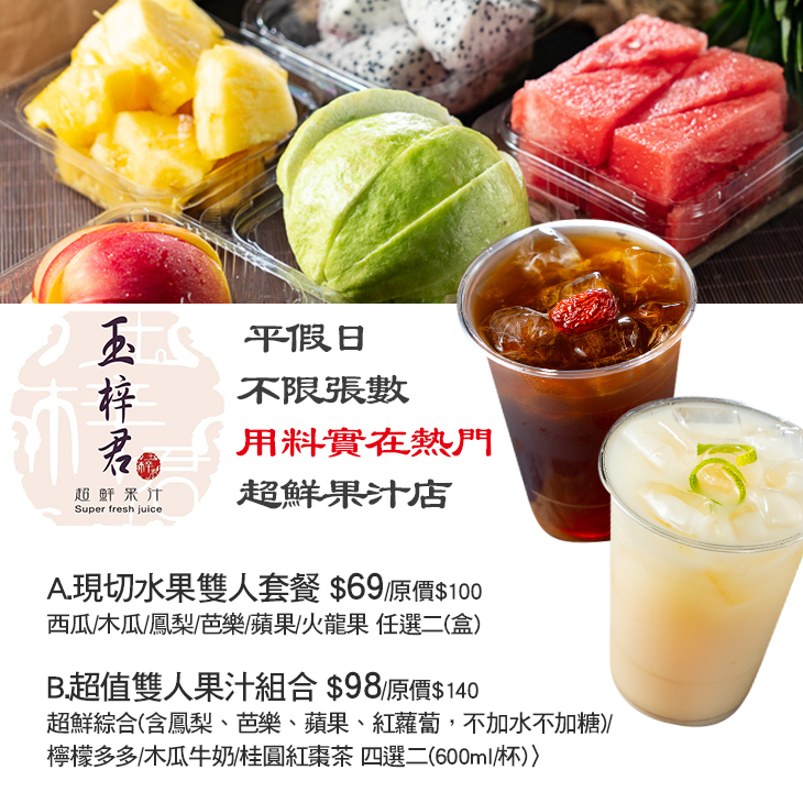近審計新村,深受青睞的【玉梓君超鮮果汁】,嚴選時令新鮮的水果,百分之百現榨成汁,不添加一滴水,讓每一位為了品嚐果汁而來的顧客,都能享受到滿滿豐盈的天然果香!而除了純果汁外,與水果搭配調製兼具健康與美味的水果風味牛奶,醇香自然的美味,保證讓您一喝成主顧、愛不釋口!