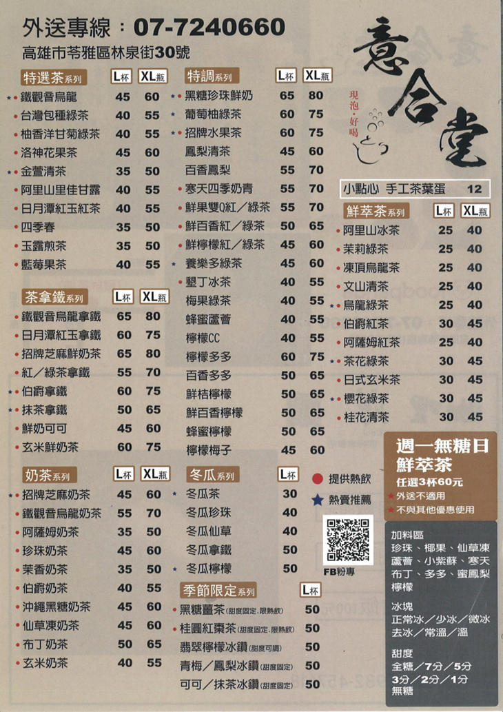 在意合堂,帶您感受不一樣的茶文化,以一杯茶的時間與溫度讓您懂茶,也愛上茶。意合堂主打現沖現泡的好喝茶飲,嚴選優質茶葉與原物料,用心沖泡以達到最好的風味,不苦不澀的茶基底,無論是融合牛奶的香濃,或是珍珠的Q軟口感,都能呈現滿分的好味道!