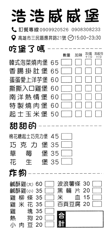 手工醃製,簡單的幸福分享給每個人!位在高雄市三民區,以創意手作漢堡為主要餐點特色的【浩浩威威堡】,將看似平凡的現烤漢堡麵包,裡頭主要的靈魂內餡主角,透過新穎組合,來成就【浩浩威威堡】最大的賣點與魅力。
