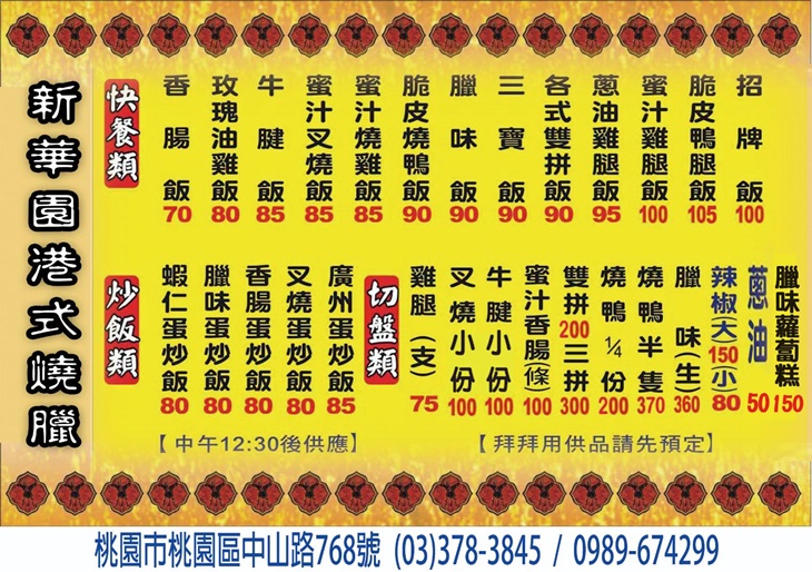 餐廳位置位在桃園市,每每營業時間一到,人潮總是源源不絕的【新華園港式燒臘】,在當地小有名氣!餐點提供以港式燒臘便當為主,舉凡蔥油雞腿、快餐類的蜜汁叉燒飯、脆皮燒鴨販、三寶飯或是炒飯類的臘味蛋炒飯、廣州蛋炒飯,菜單上有列出來的,店家絕對用心製作給您!從食材的色澤,就能感受到選料的講究;從整體的口感,就能體會到烹飪的專業,一步一腳印、一點一滴累積,只想帶給您最道地的港式燒臘料理。