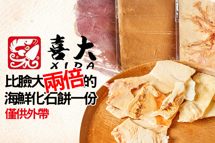 人氣必吃!運用日本訂製機器的特殊高溫熱壓工藝技術,100%保留海鮮原味,精心製成比兩張臉還大的化石餅,添加整隻新鮮蝦子、透抽和櫻花蝦,經過壓製後,從薄透的餅皮中微透出海鮮形狀,看起來就像化石藝術品般,夢幻到不行!大口咬下,就能把整隻海鮮通通吃下去,口感香脆不已,不僅嚐得到海鮮自然的甜味,還帶有一絲淡淡蒜香,不油不膩,真的好好吃!