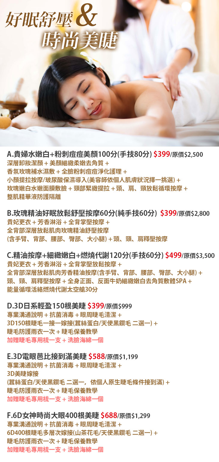 A.貴婦水嫩白+粉刺痘痘美顏100分(手技80分) / B.玫瑰精油好眠放鬆舒壓按摩60分(純手技60分) / C.精油按摩+細緻嫩白+燃燒代謝120分(手技60分) / D.3D日系輕盈150根美睫 / E.3D電眼芭比接到滿美睫 / F.6D女神時尚大眼400根美睫