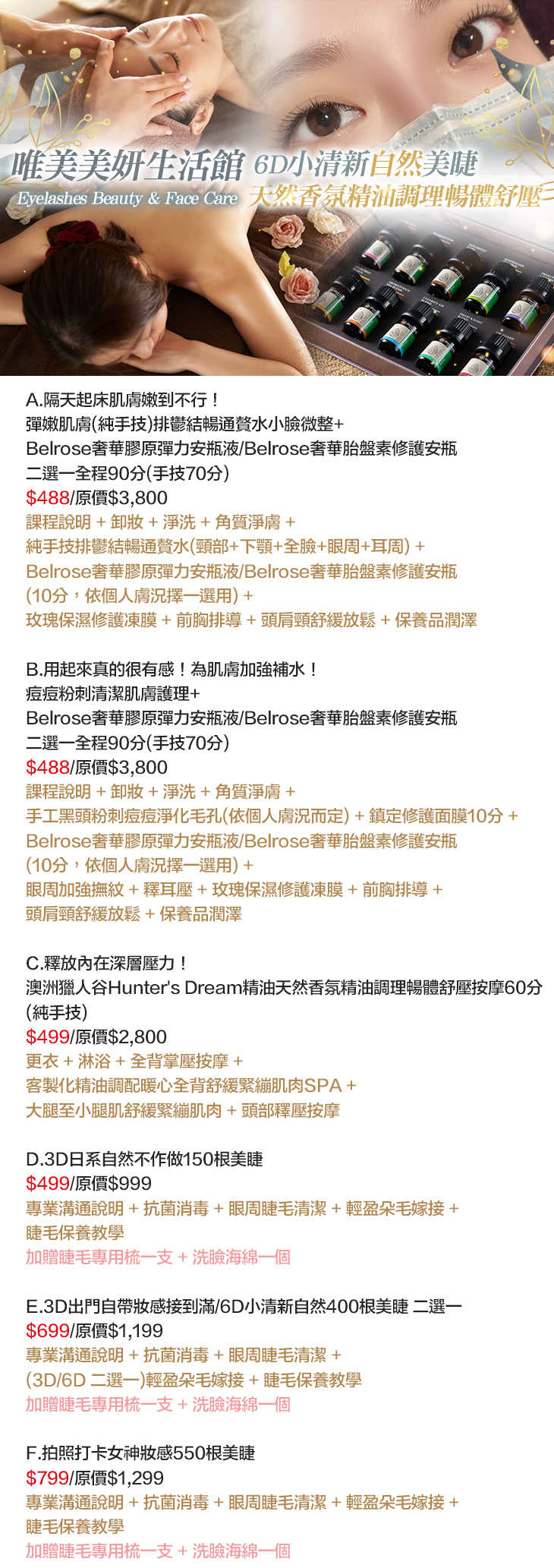 A.彈嫩肌膚(純手技)排鬱結暢通贅水小臉微整+Belrose奢華膠原彈力安瓶液/Belrose奢華胎盤素修護安瓶 二選一全程90分/B.痘痘粉刺清潔肌膚護理+Belrose奢華膠原彈力安瓶液/Belrose奢華胎盤素修護安瓶 二選一全程90分/C. 澳洲獵人谷Hunter's Dream精油天然香氛精油調理暢體舒壓按摩60分/D.3D日系自然不作做150根美睫/E.3D出門自帶妝感接到滿/6D小清新自然400根美睫 二選一/F.拍照打卡女神妝感550根美