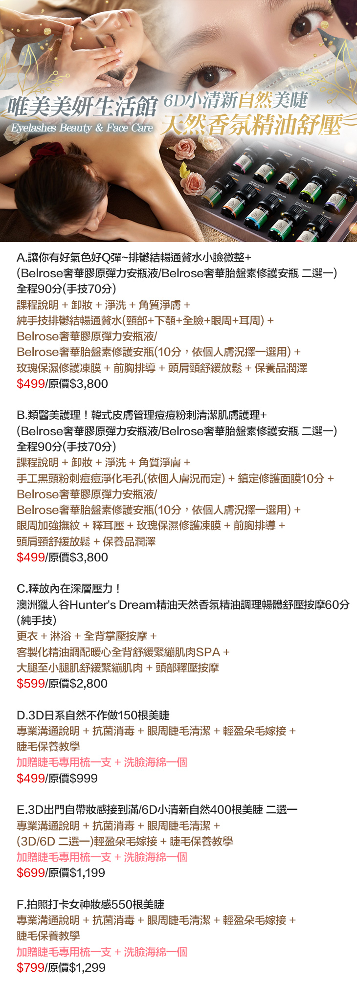 A.排鬱結暢通贅水小臉微整+(Belrose奢華膠原彈力安瓶液/Belrose奢華胎盤素修護安瓶 二選一)全程90分/B.韓式皮膚管理痘痘粉刺清潔肌膚護理+(Belrose奢華膠原彈力安瓶液/Belrose奢華胎盤素修護安瓶 二選一)全程90分/C.澳洲獵人谷Hunter's Dream精油天然香氛精油調理暢體舒壓按摩60分/D.3D日系自然不作做150根美睫/E.3D出門自帶妝感接到滿/6D小清新自然400根美睫 二選一/F.拍照打卡女神妝感550根美