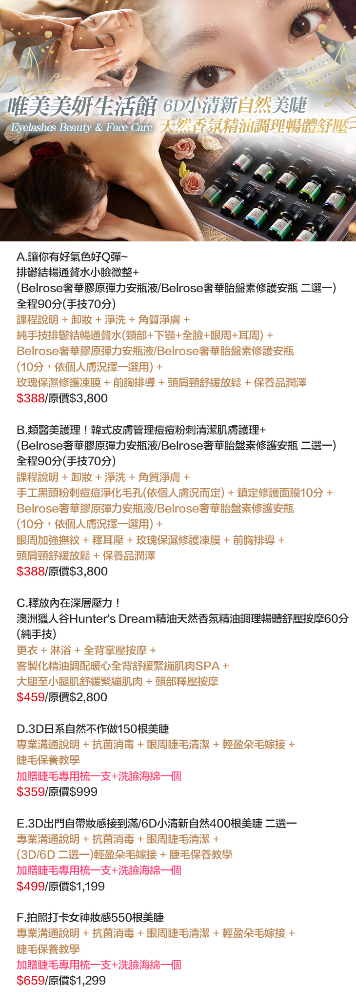 A.排鬱結暢通贅水小臉微整+(Belrose奢華膠原彈力安瓶液/Belrose奢華胎盤素修護安瓶 二選一)全程90分/B.韓式皮膚管理痘痘粉刺清潔肌膚護理+(Belrose奢華膠原彈力安瓶液/Belrose奢華胎盤素修護安瓶 二選一)全程90分/C.澳洲獵人谷Hunter's Dream精油天然香氛精油調理暢體舒壓按摩60分/D.3D日系自然不作做150根美睫/E.3D出門自帶妝感接到滿/6D小清新自然400根美睫 二選一/F.拍照打卡女神妝