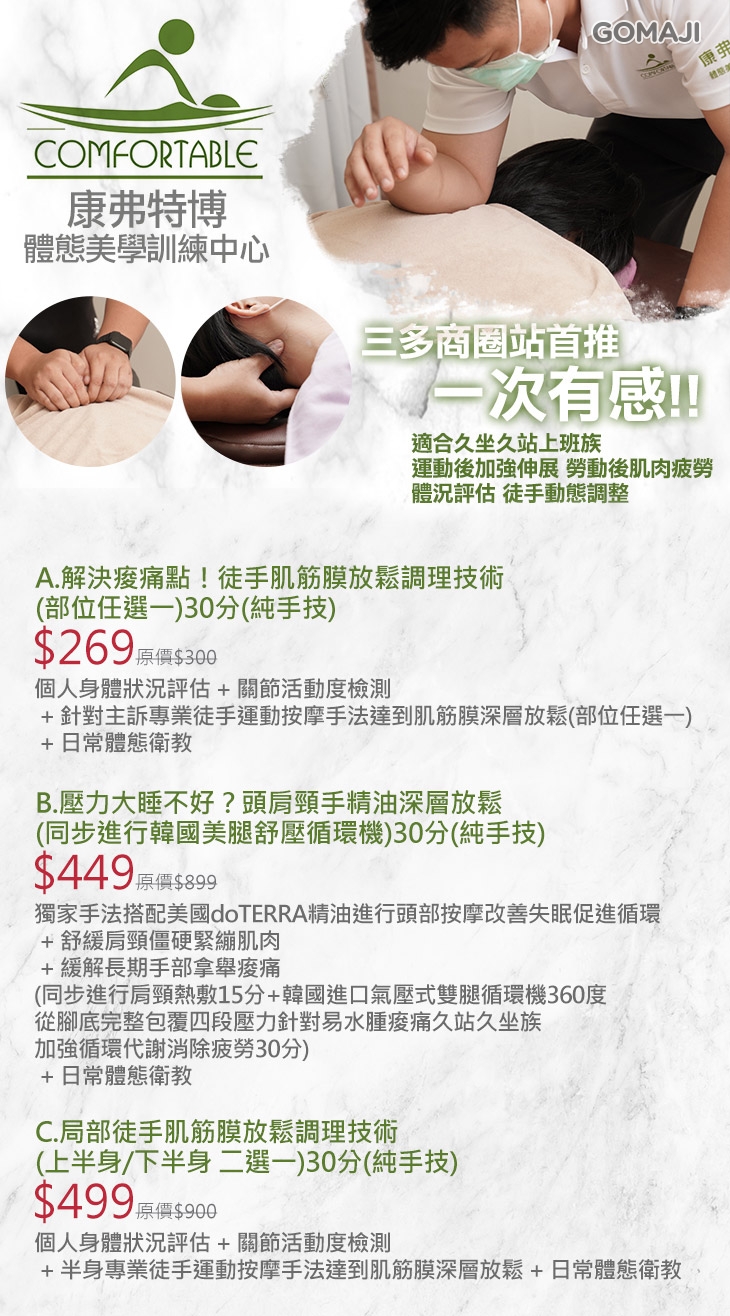 A.解決痠痛點!徒手肌筋膜放鬆調理技術(部位任選一)30分(純手技) / B.壓力大睡不好?頭肩頸手精油深層放鬆(同步進行韓國美腿舒壓循環機)30分(純手技) / C.局部徒手肌筋膜放鬆調理技術(上半身/下半身 二選一)30分(純手技)