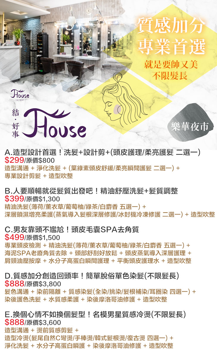 A.造型設計首選!洗髮+設計剪+(頭皮護理/柔亮護髮 二選一) / B.人要順暢就從髮質出發吧!精油舒壓洗髮+髮質調整 / C.男友靠頭不尷尬!頭皮毛囊SPA去角質 / D.質感加分創造回頭率!簡單脫俗單色染髮(不限髮長) / E.換個心情不如換個髮型!名模男星質感冷燙(不限髮長)