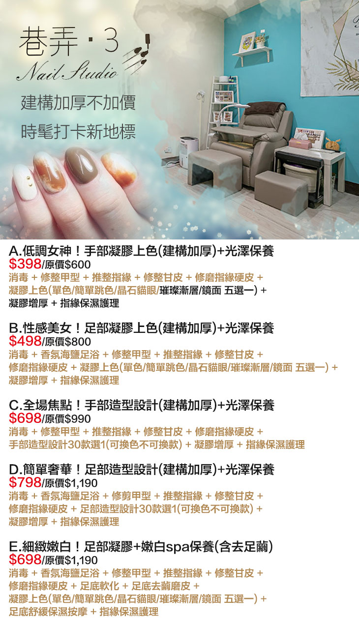 A.低調女神!手部凝膠上色(建構加厚)+光澤保養 / B.性感美女!足部凝膠上色(建構加厚)+光澤保養 / C.全場焦點!手部造型設計(建構加厚)+光澤保養 / D.簡單奢華!足部造型設計(建構加厚)+光澤保養 / E.細緻嫩白!足部凝膠+嫩白spa保養(含去足繭)