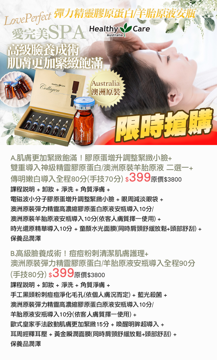 A.肌膚更加緊緻飽滿!膠原蛋增升調整緊緻小臉+雙重導入神級精靈膠原蛋白/澳洲原裝羊胎原液 二選一+傳明嫩白導入全程80分(手技70分)