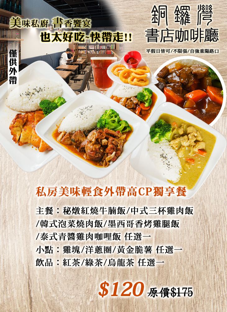 主餐:秘燉紅燒牛腩飯/中式三杯雞肉飯/韓式泡菜燒肉飯/墨西哥香烤雞腿飯/泰式青醬雞肉咖哩飯 任選一 + 小點:雞塊/洋蔥圈/黃金脆薯 任選一 + 飲品:紅茶/綠茶/烏龍茶 任選一