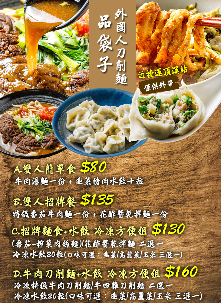 為愛飄洋過海來台灣的外國老闆,堅持選用最新鮮的食材、最健康的烹調方式,以及親自操刀的Q彈刀削麵,秉持著3Q精神-「高品質(Quality)、大份量(Quantity)、高效率(Quickly)」,逐漸在市場上贏得了許多饕客的芳心,除了販售熱食以外,同時也自營冷凍食品,保留食材最天然、最原始的甘甜滋味,每位顧客都一嚐傾心,道道都是令人欲罷不能的獨門料理~~~小資麻吉們快罩過來,一起享用這大份量又健康的餐點&冷凍食品!!!