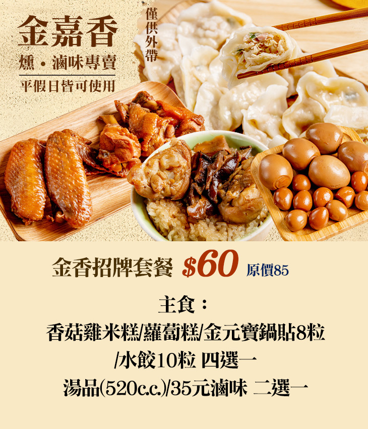 〈主食:香菇雞米糕/蘿蔔糕/金元寶鍋貼8粒/水餃10粒 四選一 + 湯品(520c.c.)/35元滷味 二選一〉