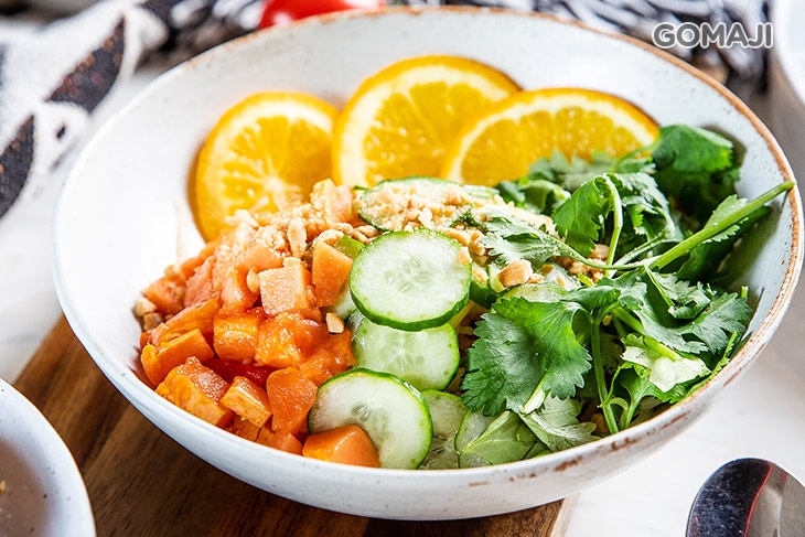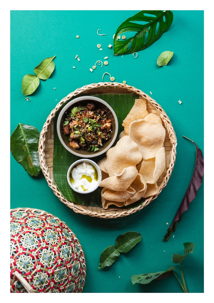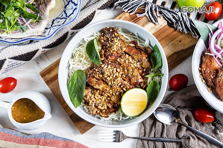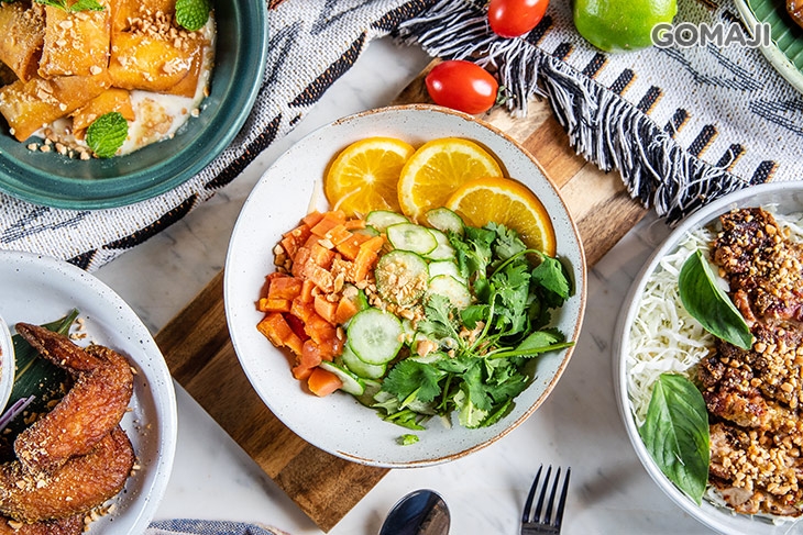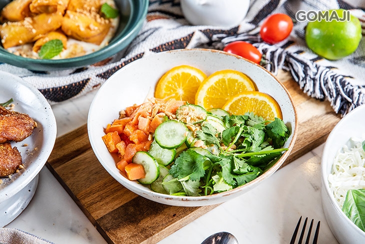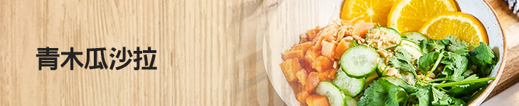 泰式料理中最經典、不可錯過的開胃前菜──青木瓜沙拉,將搗碎的小辣椒、蒜頭,淋上香氣獨特的椰糖與酸爽的新鮮檸檬汁、及不可或缺的魚露,拌入手工切細的青木瓜絲中,並搭配清涼脆口的小黃瓜與多汁水果,酸酸辣辣、清爽開胃,在主餐前享用最對味!
