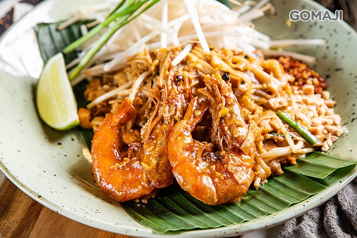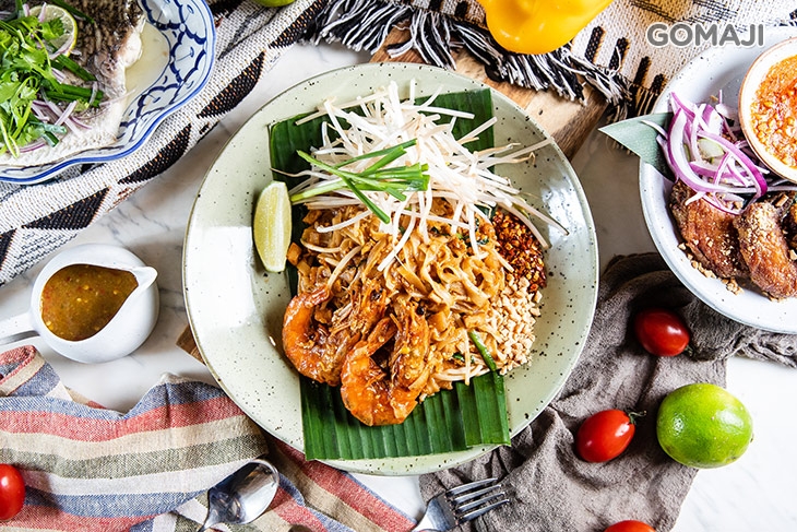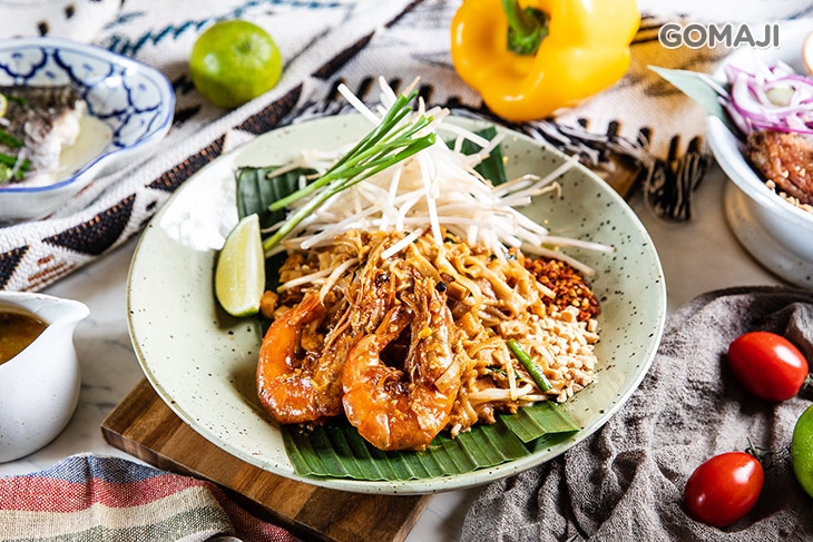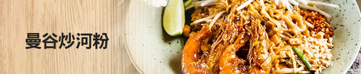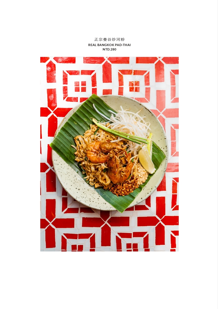 精選碩大肥美的鮮蝦、嫩魚…等新鮮甘甜的海料,使用主廚特調的自製泰式醬汁入味,再拌入晶瑩剔透、口感Q彈的河粉,以半乾煎的手法將河粉煎炒至略帶焦香。一上菜,那迎面而來的泰式香氣,便讓人口水直流!入口品嚐,海鮮、醬料、河粉、青木瓜絲、剁碎花生、辣椒…各式各樣的風味在口中綻放,辣而不嗆、鹹香開胃,越吃越好吃!