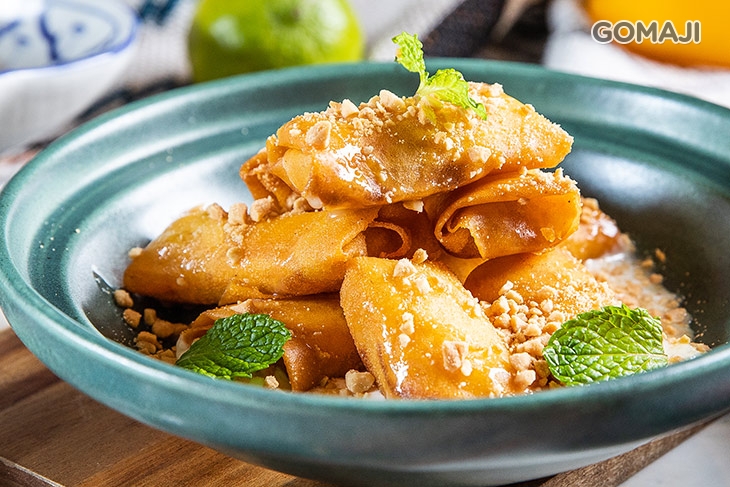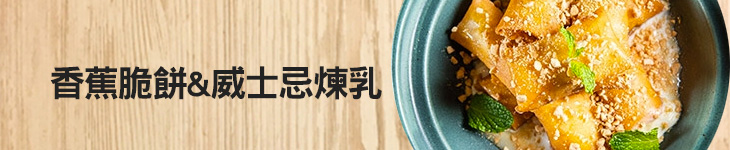 泰國最熱門的街頭小吃──香蕉煎餅,在主廚巧手改造下,變身為口感更為酥香、脆口的香蕉脆餅!一口咬下那香、酥、脆,感覺香蕉煎餅的美味被昇華,搭配特調的威士忌煉乳,感受香氣迷人的尾韻縈繞在齒唇之間,稍加成熟的風味將甜香的香蕉脆餅襯托得甜而不膩~高貴、細膩的風味,給您全新、更時髦、更精緻的泰式甜品饗宴!