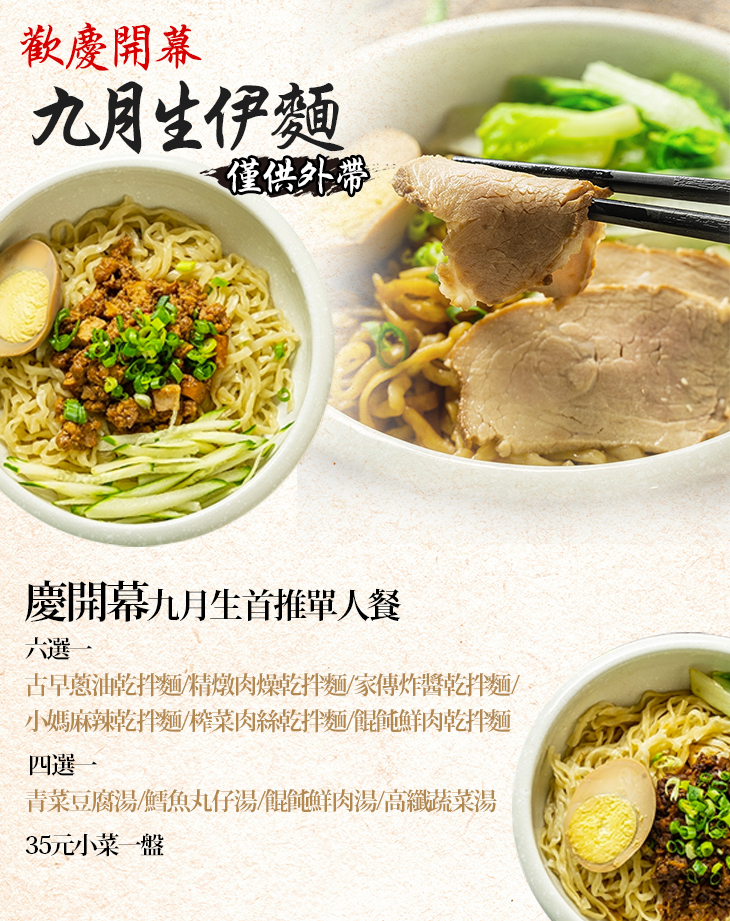 「即使簡單吃,你也可以吃得很安心,因為我會用照顧家人的心來款待你。我是九月生,我最愛吃意麵。」地點位在台中市北屯區,裝潢簡約、風格低調的【九月生伊麵】,料理主要特色以販售乾拌麵為主,口味豐富、選擇多元!即便只是單純的乾拌麵,也會因為用心調配的醬汁與精心組合的配菜,讓您擁有截然不同的體驗與觀感!選用特製Q彈麵條,完美呈現道地台灣小吃,銷魂的滋味保證讓您一吃就愛上!