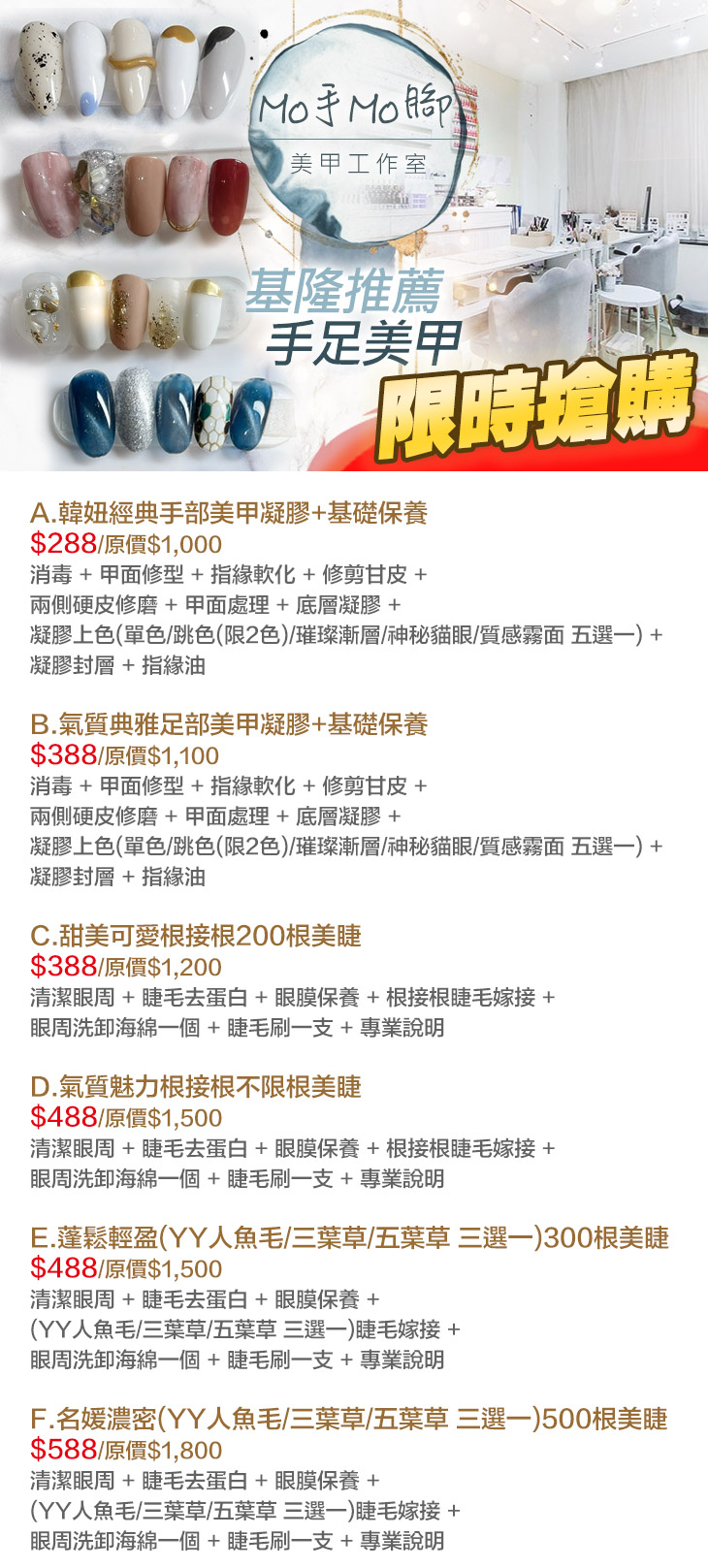 A.韓妞經典手部美甲凝膠+基礎保養 / B.氣質典雅足部美甲凝膠+基礎保養 / C.甜美可愛根接根200根美睫 / D.氣質魅力根接根不限根美睫 / E.蓬鬆輕盈(YY人魚毛/三葉草/五葉草 三選一)300根美睫 / F.名媛濃密(YY人魚毛/三葉草/五葉草 三選一)500根美睫