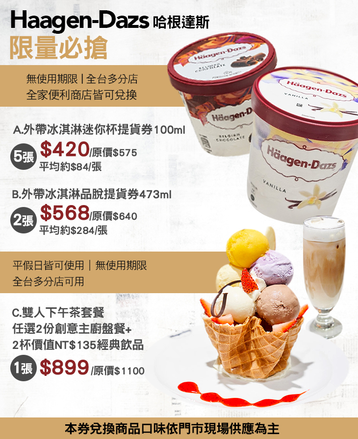 限量必搶!外帶冰淇淋迷你杯提貨券100ml/外帶冰淇淋品脫提貨券473ml/雙人下午茶套餐一份(無使用期限/全台多分店/全家便利商店皆可兌換/平假日皆可使用)