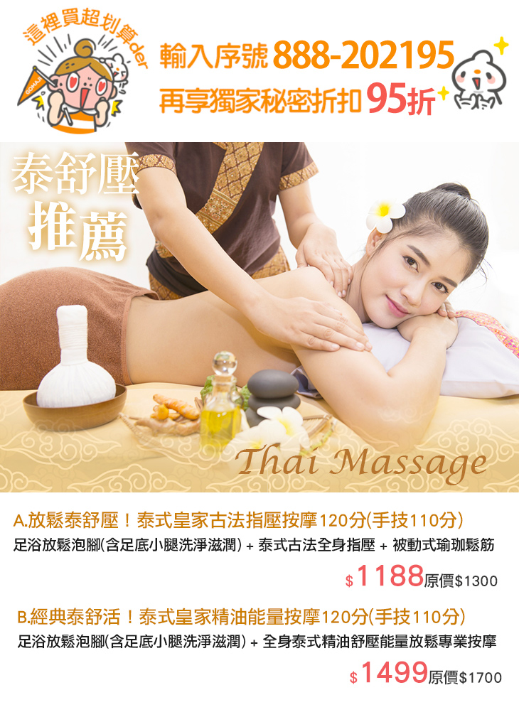 A.放鬆泰舒壓!泰式皇家古法指壓按摩120分(手技110分)