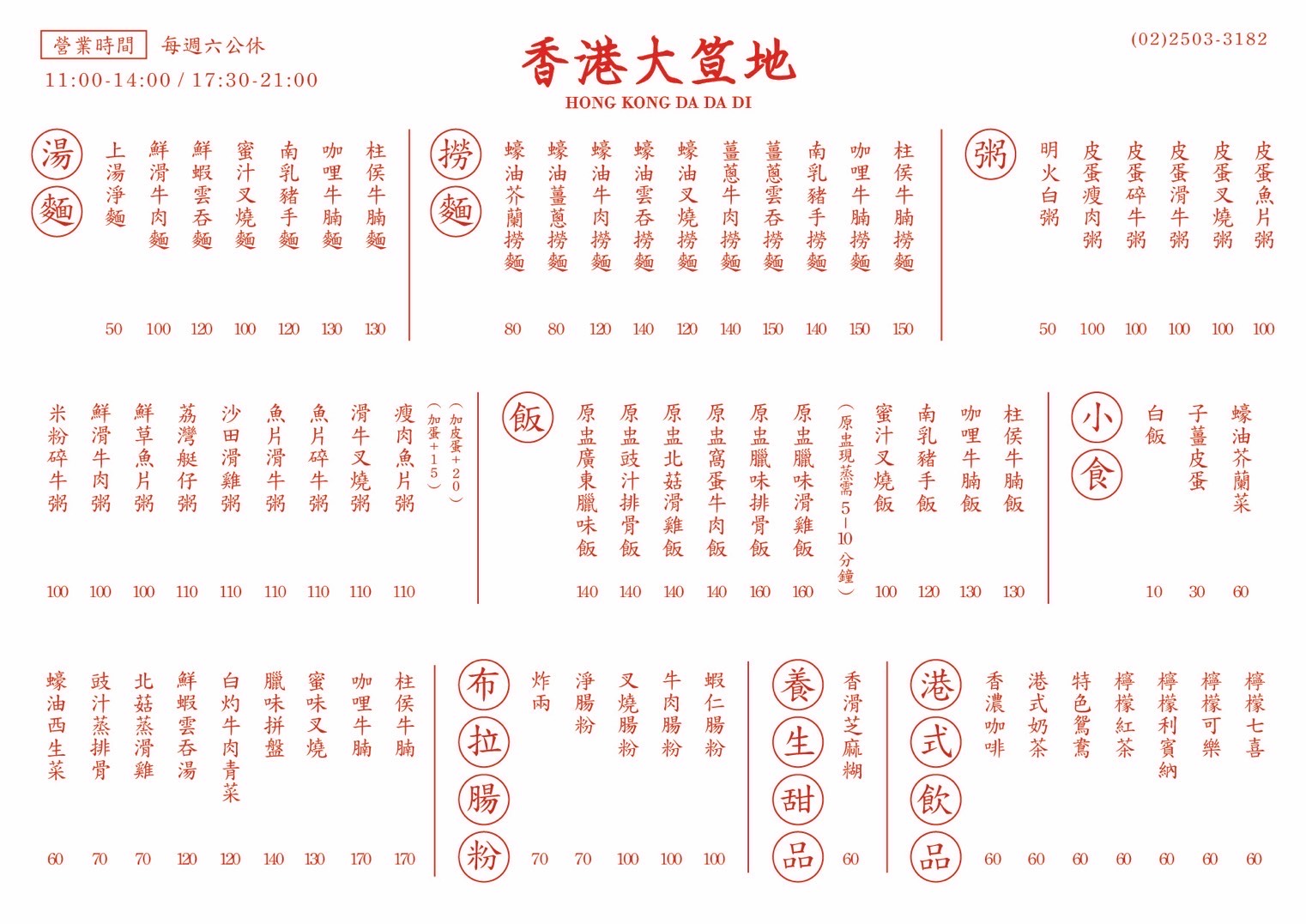 「大笪地」位在香港上環,由廣場發展成熱鬧的夜市,販售著大排檔等諸多庶民美食,便宜又好吃,是當地人的飽腹首選,也是各國旅客去過都說讚的必訪地點。現在,無須飛出國就能吃到源自香港街邊的好味道~鄰近於北捷中山國中站,品項多元、料多實在,且設有舒適整潔、桌距寬敞的用餐環境,保證讓您吃飽喝足、不虛此行!