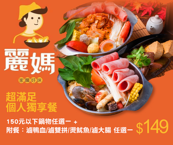 150元以下鍋物任選一 + 附餐:滷鴨血/滷雙拼/燙魷魚/滷大腸 任選一