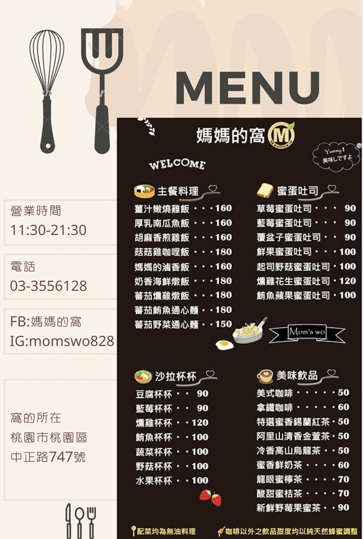 健康、無油餐廳,讓夠麻吉小編介紹給您!地點位在桃園市桃園區,餐點提供主餐料理 - 厚乳南瓜魚飯、媽媽的滷香飯、薑汁嫩燒雞飯、蜜蛋吐司 - 草莓蜜蛋、鮮果蜜蛋及沙拉、飲品等創意不失特色料理的【媽媽的窩】,與夠麻吉攜手合作推出專屬優惠囉!