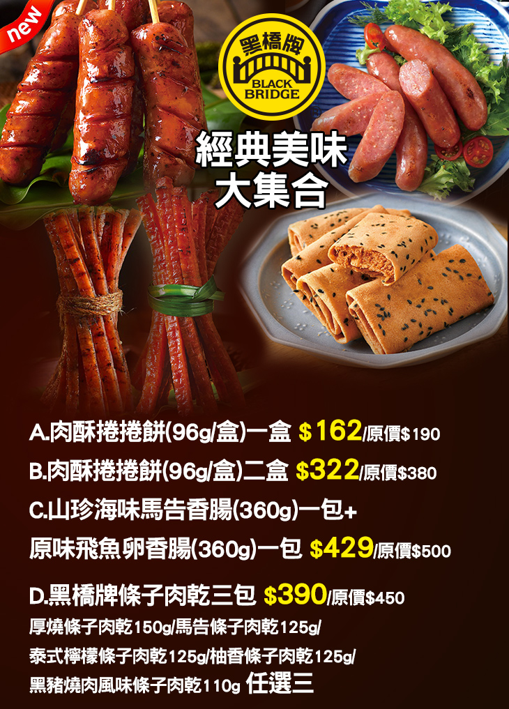 A.肉酥捲捲餅(96g/盒)一盒 / B.肉酥捲捲餅(96g/盒)二盒 / C.山珍海味馬告香腸(360g)一包+原味飛魚卵香腸(360g)一包 / D.黑橋牌條子肉乾三包
