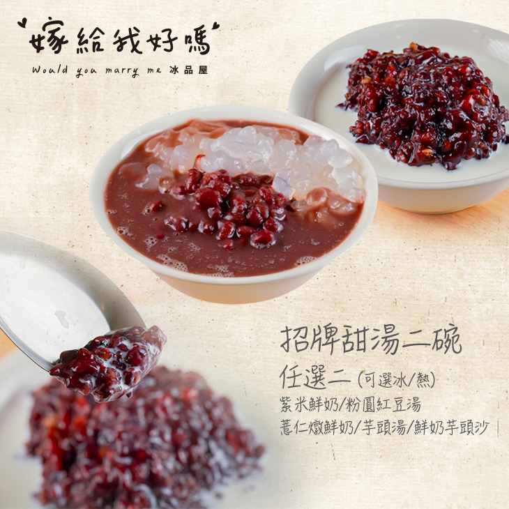 〈紫米鮮奶/粉圓紅豆湯/薏仁燉鮮奶/芋頭湯/鮮奶芋頭沙 任選二(可選冰/熱)〉